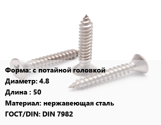 Саморез с потайной головкой D=4.8 L=50 нержавеющая сталь ГОСТ: DIN 7982